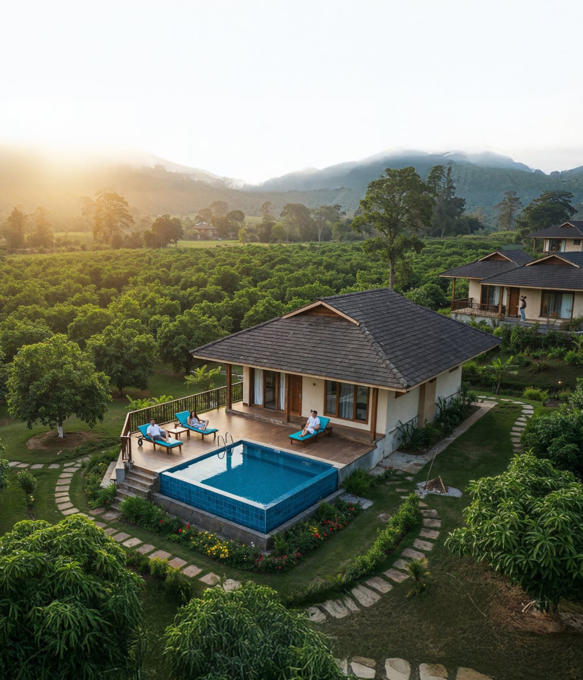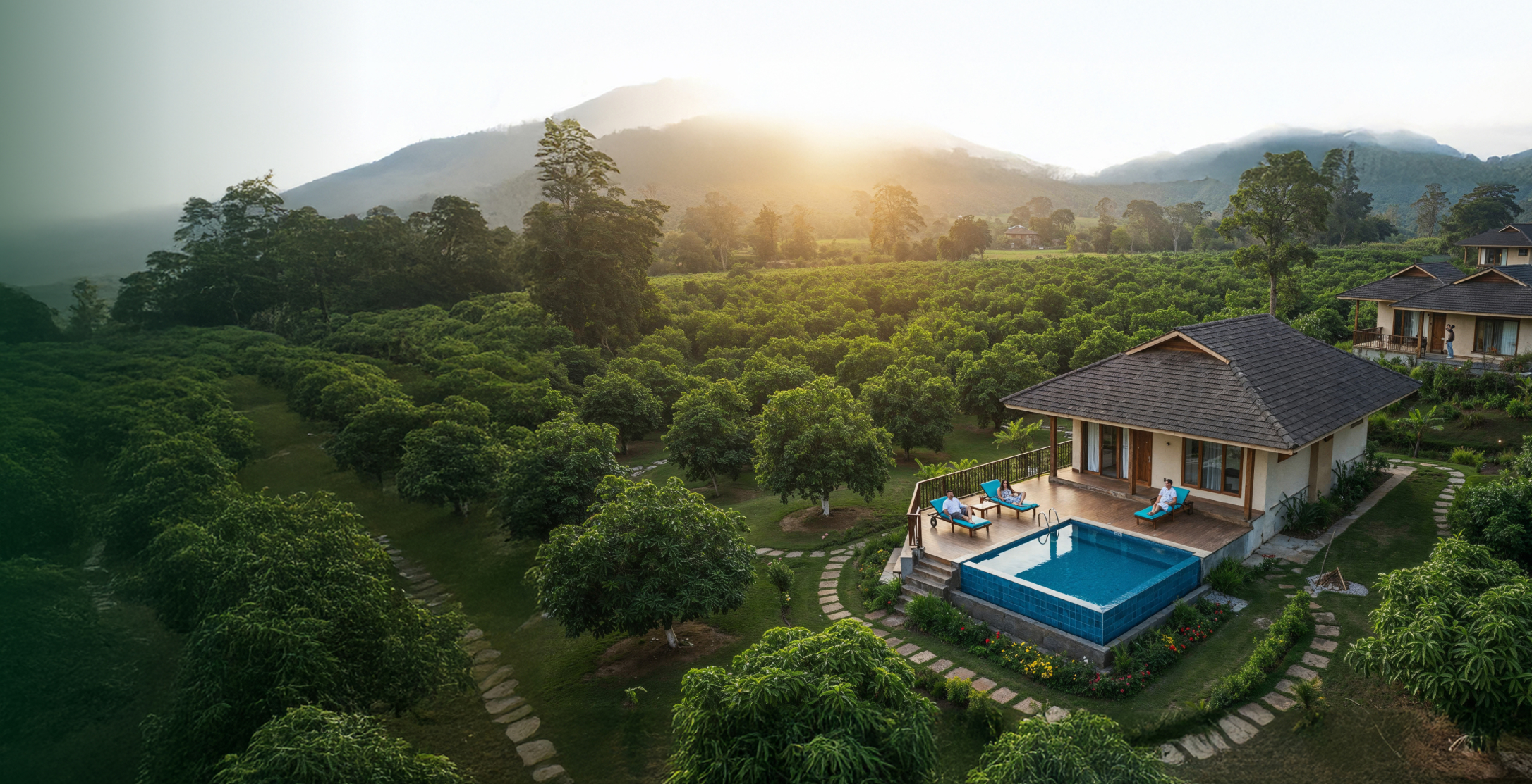 A low-density layout with 150 farmhouses, private pool villas, and nature-first zoning across five zones of wellness, nature, and wonder.